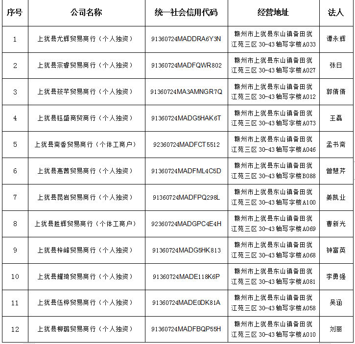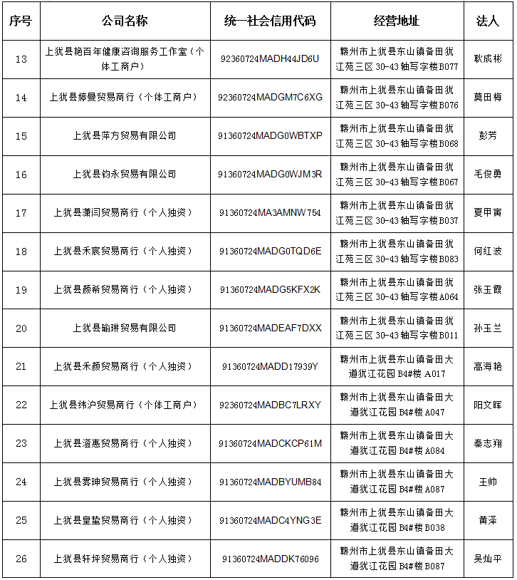 上猶縣尤輝貿(mào)易商行(個人獨資)等37家市場主體: