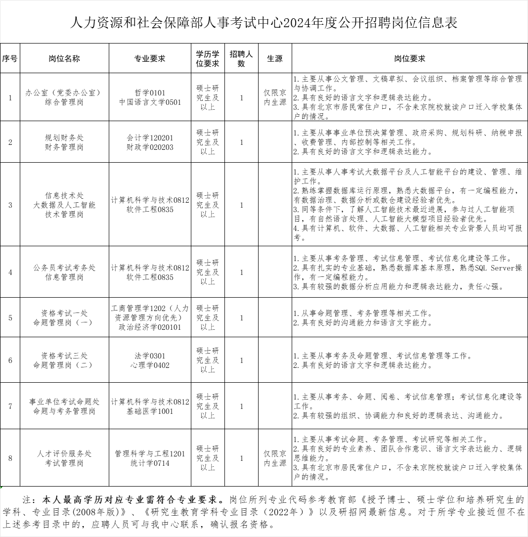 招聘崗位及資格條件詳見(jiàn)附件《人力資源和社會(huì)保障部人事考試中心2024年度公開(kāi)招聘崗位信息表》。