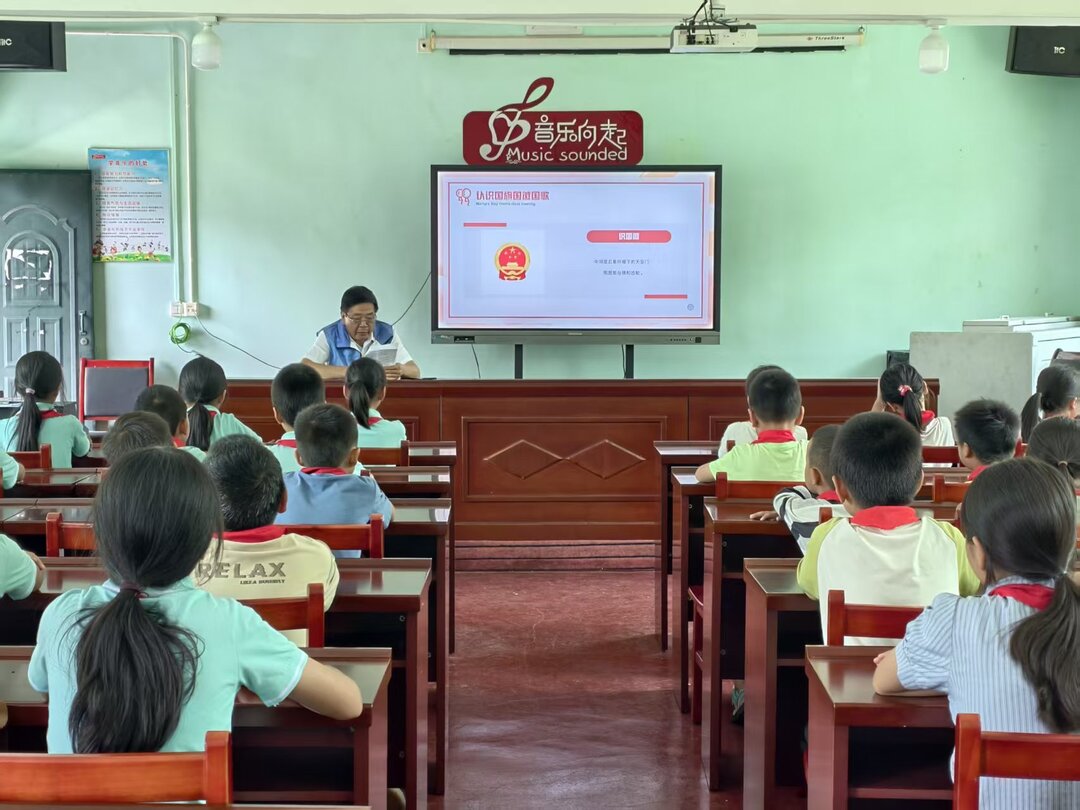 活動(dòng)在師生肅立齊唱《義勇軍進(jìn)行曲》的莊嚴(yán)儀式中啟幕。稚嫩而嘹亮的歌聲回蕩校園,孩子們以最真摯的情感向祖國(guó)致敬,奠定活動(dòng)基調(diào)。志愿者以“致敬國(guó)旗,祝福祖國(guó)”為主題展開宣講,通過動(dòng)態(tài)圖解與歷史影像闡釋國(guó)旗、國(guó)徽的象征意義與國(guó)慶節(jié)歷史由來。結(jié)合五指峰鄉(xiāng)生態(tài)修復(fù)、鄉(xiāng)村旅游等發(fā)展成就,展現(xiàn)家鄉(xiāng)巨變,引導(dǎo)孩子們領(lǐng)悟“家是最小國(guó),國(guó)是千萬家”的內(nèi)涵。宣講中,孩子們聚精會(huì)神,互動(dòng)積極,展現(xiàn)出強(qiáng)烈的求知欲與愛國(guó)熱情。