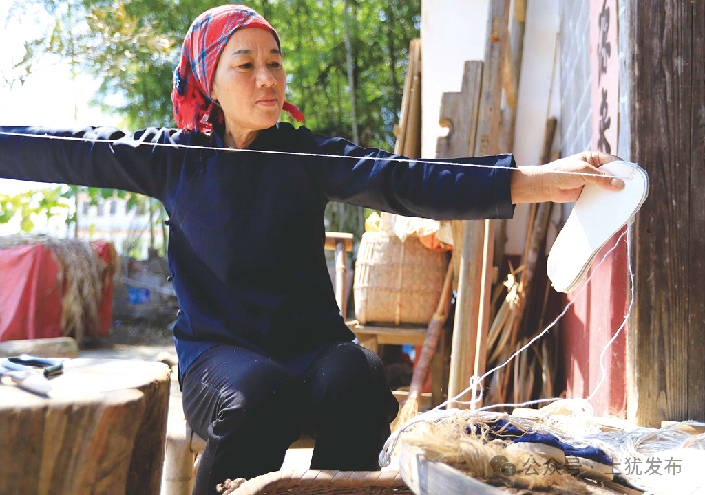 王惠仁從籮筐中取出一根麻繩線,跟我們解釋道:“過去,搓麻繩用的是從山上采下來的苧麻,去除枝葉和根莖,將苧麻皮放在鍋中熬煮,取出后放到清水中反復(fù)捶打漂洗,直至成為白色,將兩根細長的熟麻揉搓合并為一根,就是現(xiàn)在我們看到的麻繩了?!闭f完,她將同一只鞋的三至五個布板模型疊放在一起,將兩頭縫合固定后,用鉆子穿麻繩線,沿著固定的鞋底四周邊緣依次縫上兩圈,一圈鞋底就完成了。