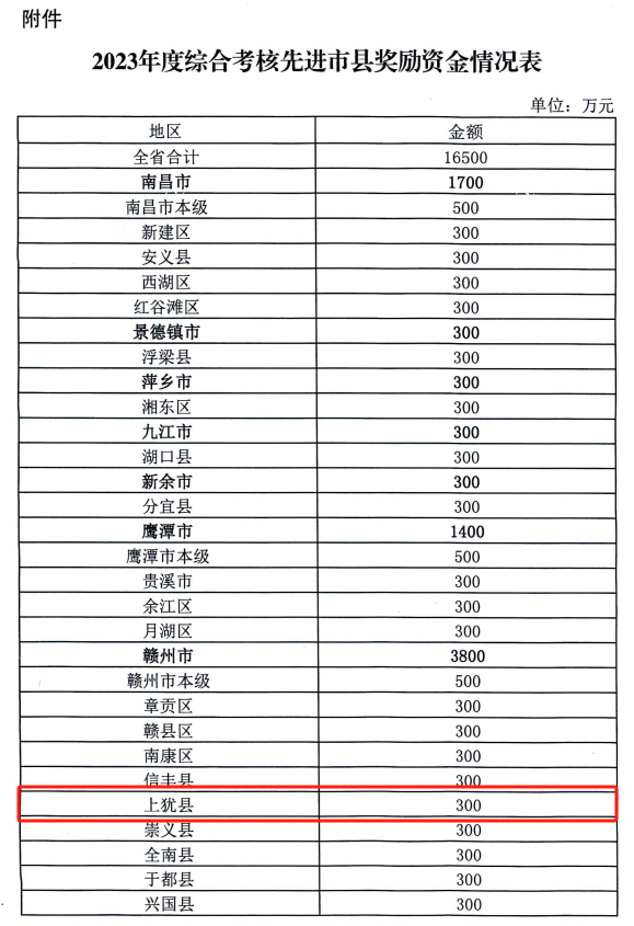 根據(jù)《中共江西省委 江西省人民政府關(guān)于2023年度綜合考核結(jié)果的通報(bào)》(贛委〔2024〕96號(hào))和確定的獎(jiǎng)勵(lì)標(biāo)準(zhǔn),省財(cái)政近期下達(dá)獎(jiǎng)勵(lì)資金1.65億元,對(duì)獲得2023年度綜合考核第一等次的6個(gè)設(shè)區(qū)市和45個(gè)縣(市、區(qū))各分別給予500萬(wàn)元、300萬(wàn)元的資金獎(jiǎng)勵(lì)。激勵(lì)推動(dòng)各地各部門聚焦“走在前、勇?tīng)?zhēng)先、善作為”的目標(biāo)要求,對(duì)標(biāo)先進(jìn)、比學(xué)趕超、攻堅(jiān)克難、真抓實(shí)干,加快推動(dòng)全省高質(zhì)量發(fā)展,奮力譜寫全面建設(shè)社會(huì)主義現(xiàn)代化江西的新篇章。附:2023年度綜合考核先進(jìn)市縣獎(jiǎng)勵(lì)資金情況表