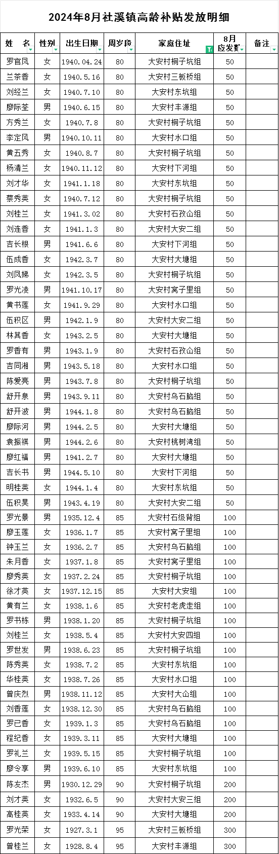 【高齡補貼】2024年08月社溪鎮(zhèn)大安村80周歲以上老人高齡補貼發(fā)放表