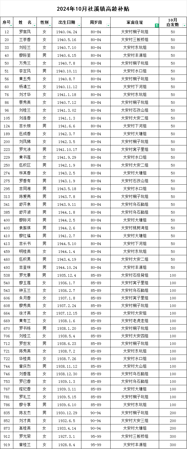 【高齡補(bǔ)貼】2024年10月社溪鎮(zhèn)大安村80周歲以上老人高齡補(bǔ)貼公示