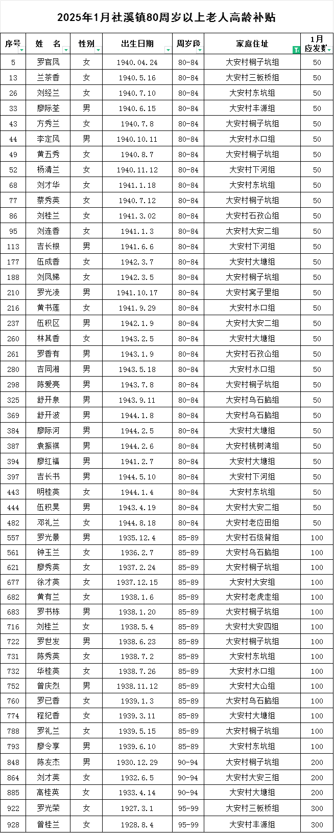 【高齡補(bǔ)貼】2025年1月社溪鎮(zhèn)大安村80周歲以上老人高齡補(bǔ)貼公示