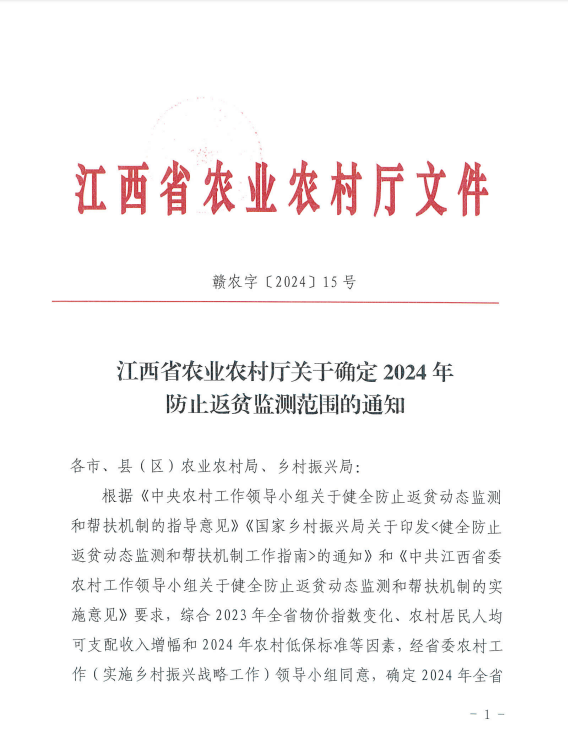 【文件通知】江西省農(nóng)業(yè)農(nóng)村廳關(guān)于確定2024年防止返貧監(jiān)測范圍的通知
