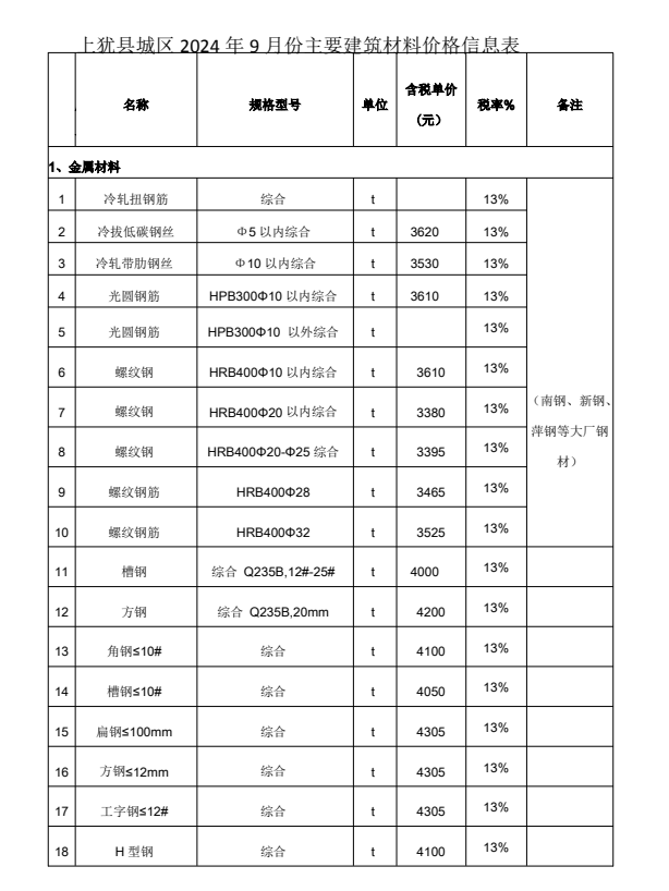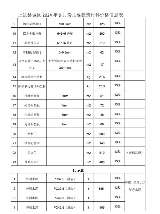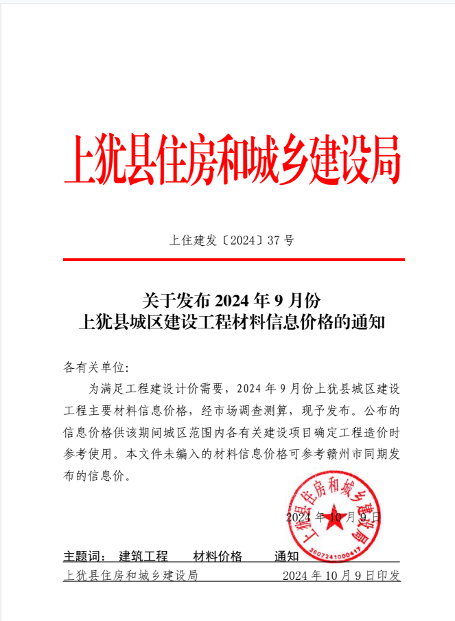 關(guān)于發(fā)布2024年10月份上猶縣城區(qū)建設(shè)工程材料信息價(jià)格的通知