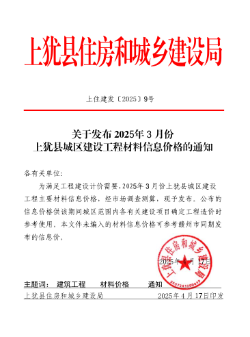 關(guān)于發(fā)布2025年3月份上猶縣城區(qū)建設(shè)工程材料信息價(jià)格的通知