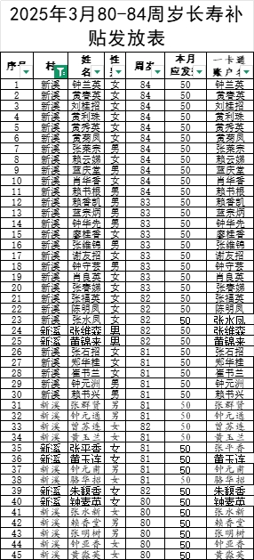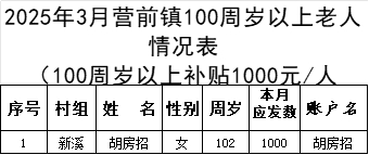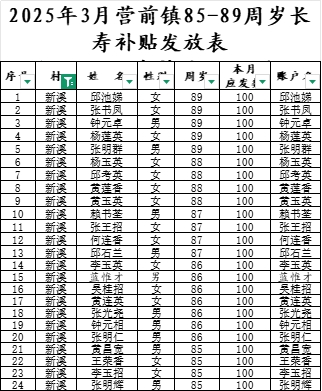 2025年3月營前鎮(zhèn)新溪村長壽補貼發(fā)放表