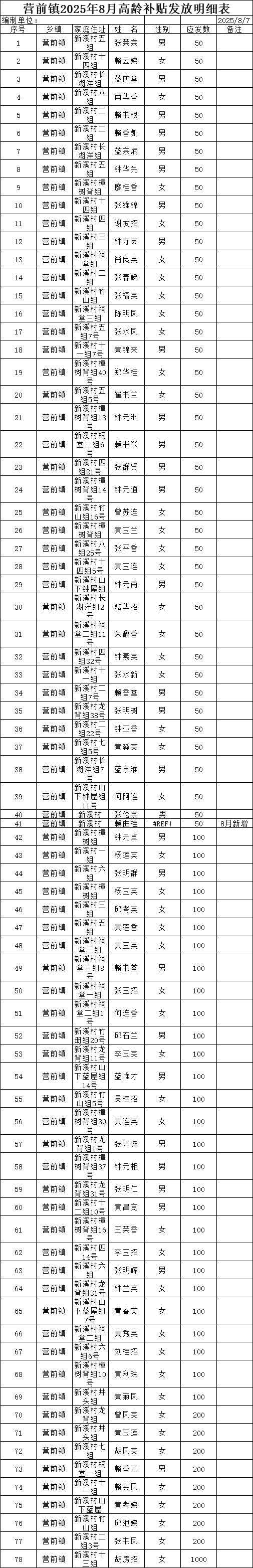 2025年?duì)I前鎮(zhèn)新溪村高齡補(bǔ)貼發(fā)放表