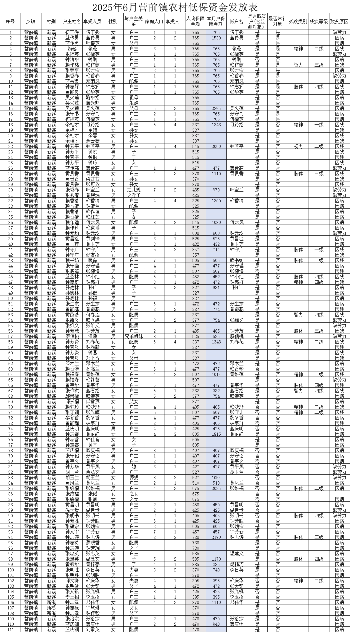 2025年6月營前鎮(zhèn)新溪村低保金發(fā)放表
