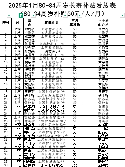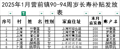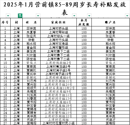 2025年1月營前鎮(zhèn)上灣村長壽補貼發(fā)放表