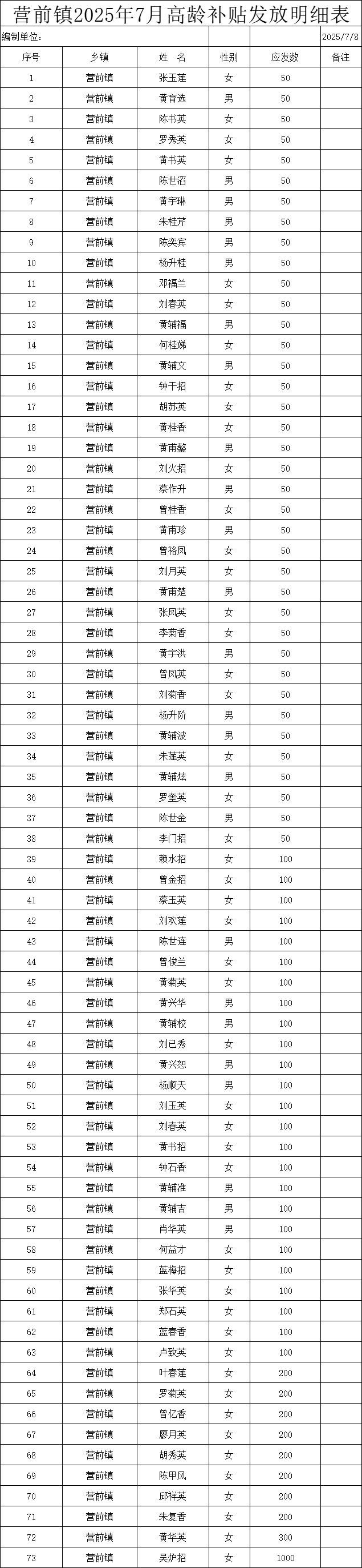 營前鎮(zhèn)上灣村2025年7月高齡補(bǔ)貼發(fā)放明細(xì)表