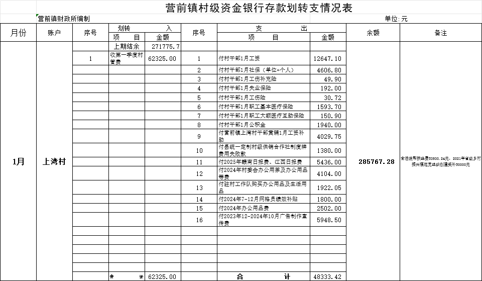 營前鎮(zhèn)上灣村2025年1月村級(jí)財(cái)務(wù)收支