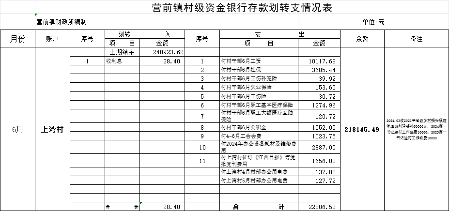 營前鎮(zhèn)上灣村2025年6月村級財務(wù)收支情況表