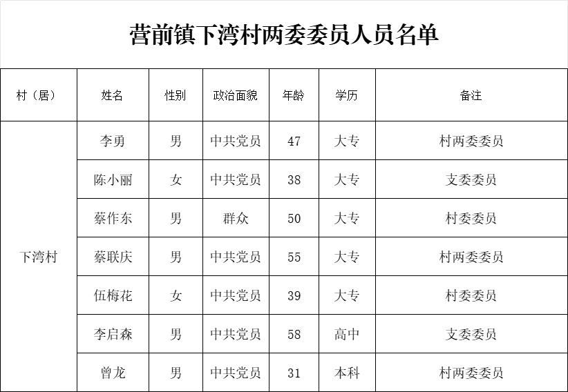 您當前的位置: 首頁 >專題專欄 >營前鎮(zhèn)全面推進基層政務(wù)公開標準化規(guī)范化 >村(居)務(wù)公開 >下灣村 >兩委班子