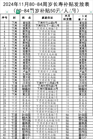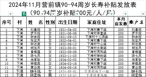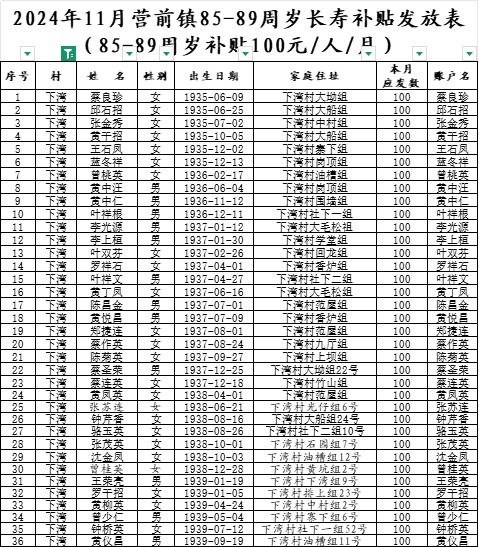 2024年營前鎮(zhèn)下灣村11月長壽補貼發(fā)放表