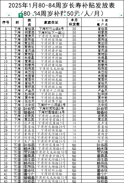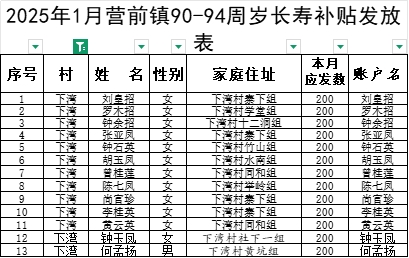 2025年1月營前鎮(zhèn)下灣村長壽補(bǔ)貼發(fā)放表