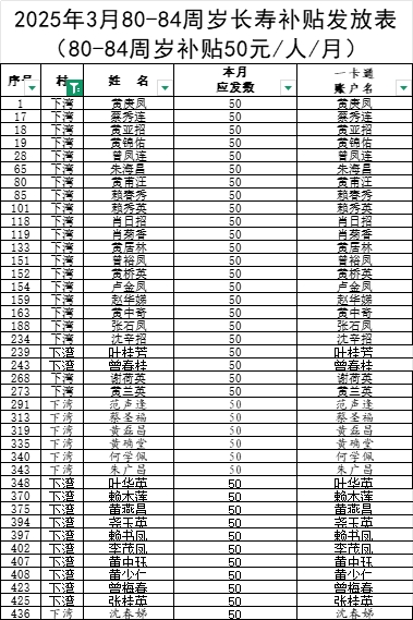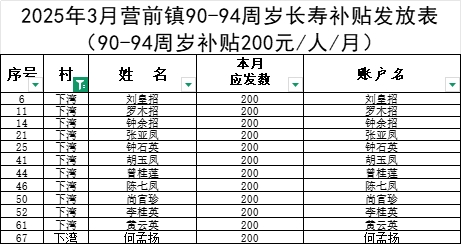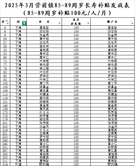 2025年3月營前鎮(zhèn)下灣村長(zhǎng)壽補(bǔ)貼發(fā)放表