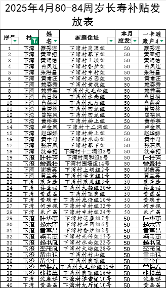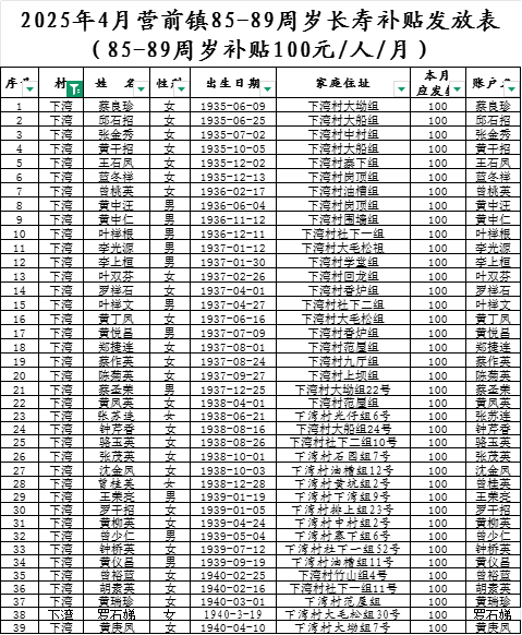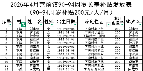 2025年4月?tīng)I(yíng)前鎮(zhèn)下灣村長(zhǎng)壽補(bǔ)貼發(fā)放表