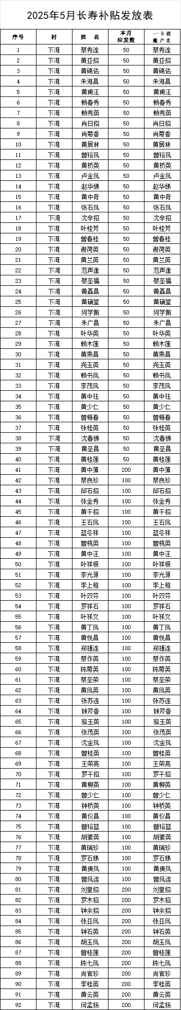 2025年5月下灣村長(zhǎng)壽補(bǔ)貼發(fā)放表