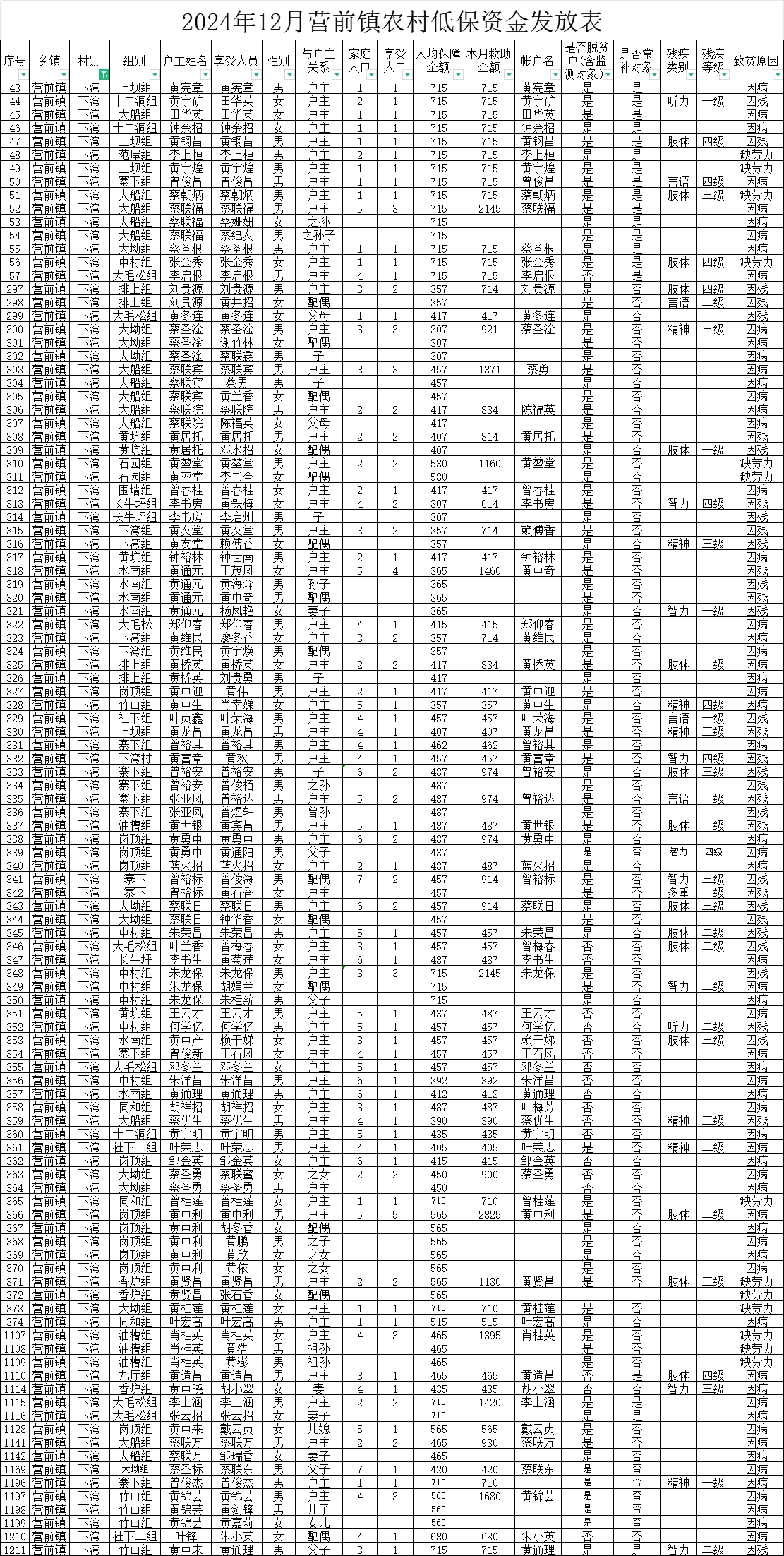 2024年12月營前鎮(zhèn)下灣村低保金發(fā)放表