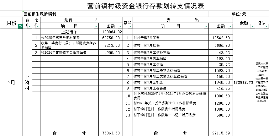 營(yíng)前鎮(zhèn)下灣村級(jí)資金銀行存款劃轉(zhuǎn)支情況表