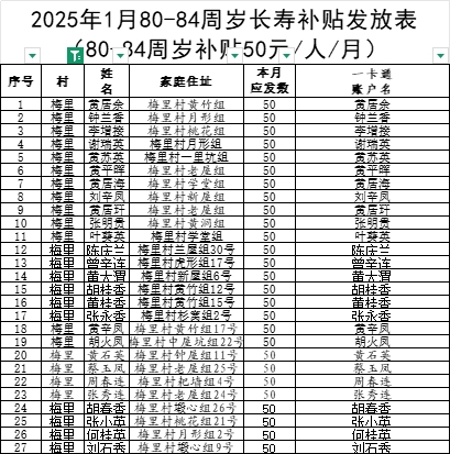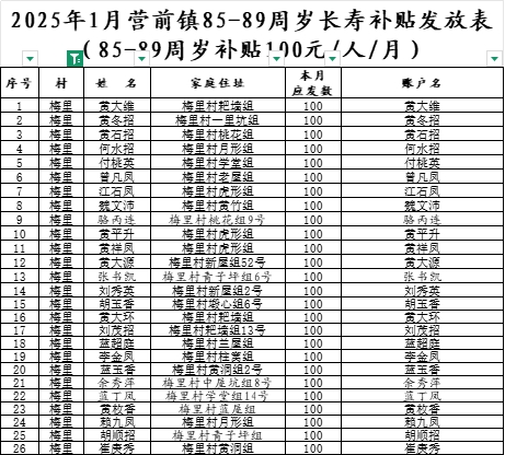 2025年1月營前鎮(zhèn)梅里村長壽補貼發(fā)放表