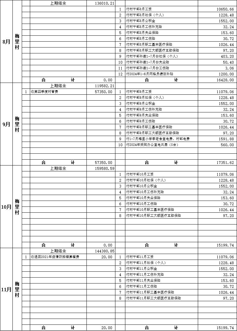 營(yíng)前鎮(zhèn)梅里村2024年8-11月村級(jí)財(cái)務(wù)收支