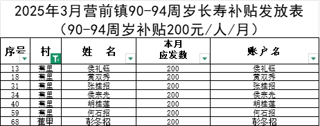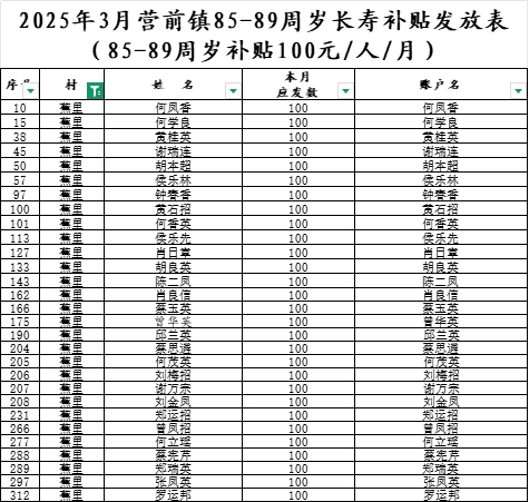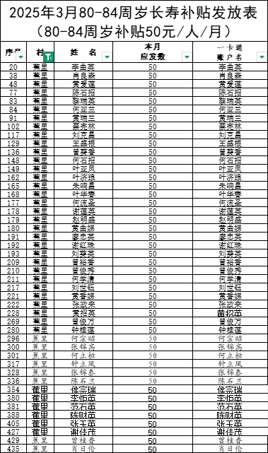 2025年3月營前鎮(zhèn)蕉里村長壽補貼發(fā)放表