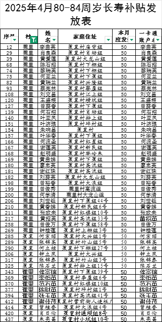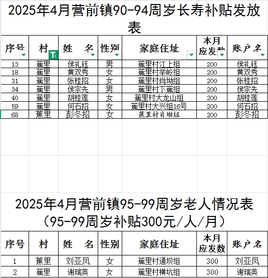 2025年4月?tīng)I(yíng)前鎮(zhèn)蕉里村長(zhǎng)壽補(bǔ)貼發(fā)放表