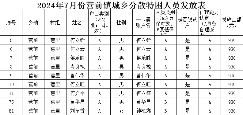 2024年7月營前鎮(zhèn)蕉里村分散特困供養(yǎng)人員生活費發(fā)放表
