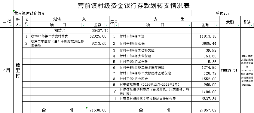 營前鎮(zhèn)蕉里村2025年4月財務收支表