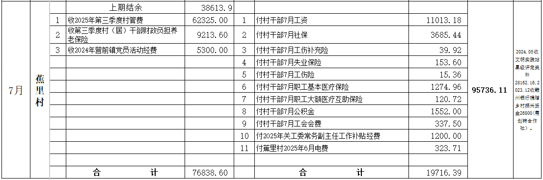營前鎮(zhèn)蕉里村2025年7月村級財務(wù)收支登記表