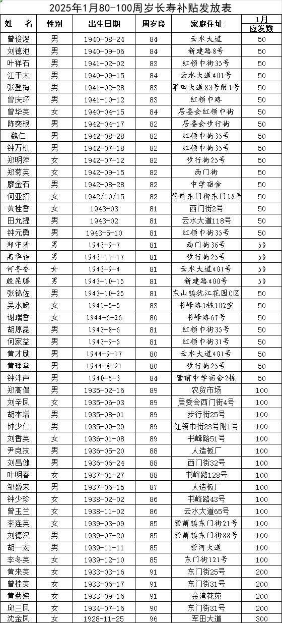 2025年1月?tīng)I(yíng)前鎮(zhèn)居委會(huì)長(zhǎng)壽補(bǔ)貼發(fā)放表