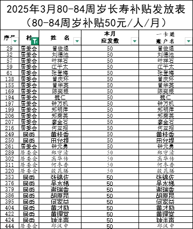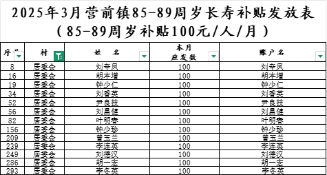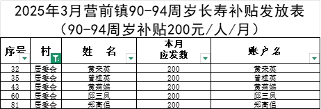 2025年3月營前鎮(zhèn)居委會(huì)長壽補(bǔ)貼發(fā)放表