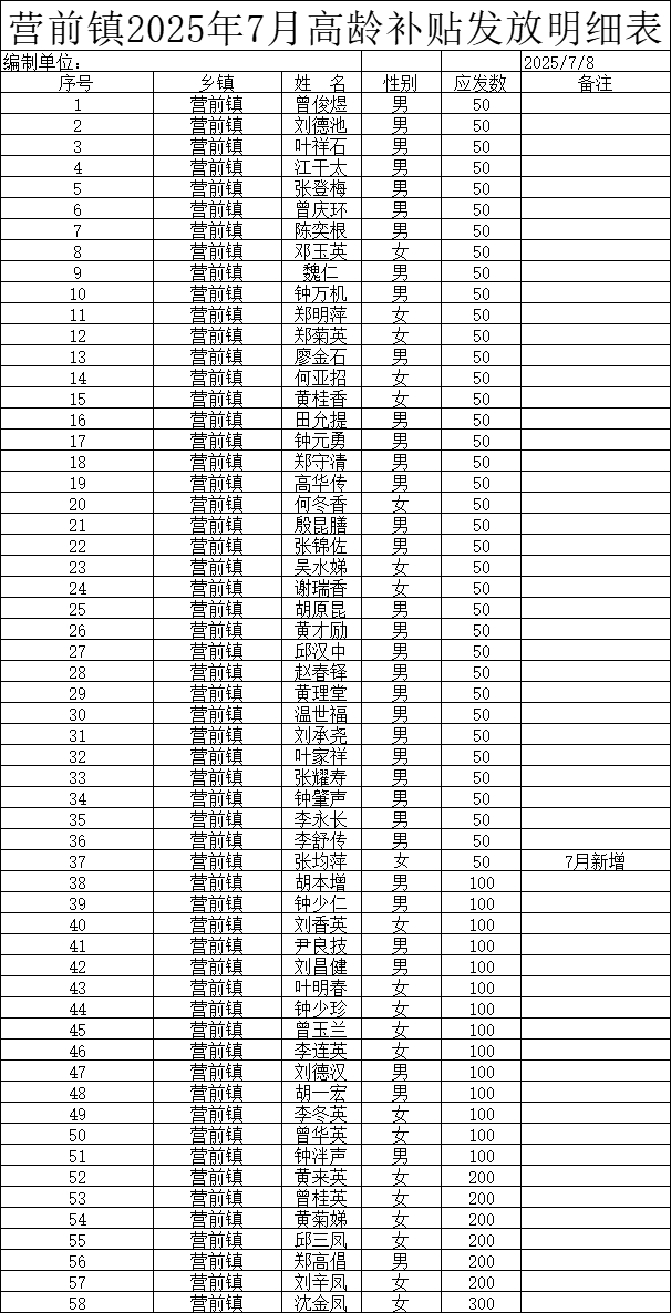 營(yíng)前鎮(zhèn)居委會(huì)2025年7月高齡補(bǔ)貼發(fā)放明細(xì)表