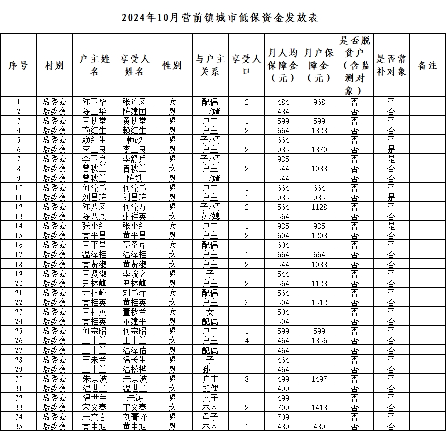 2024年10月營前街居委會低保發(fā)放表