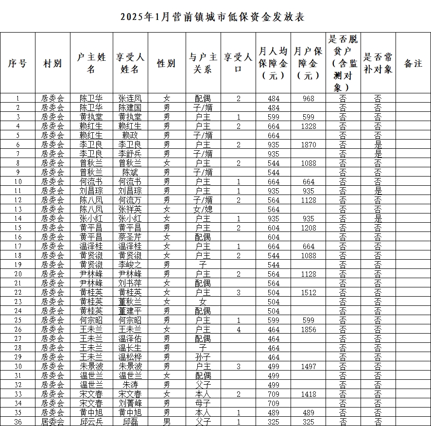 2025年1月?tīng)I(yíng)前鎮(zhèn)居委會(huì)低保資金發(fā)放表