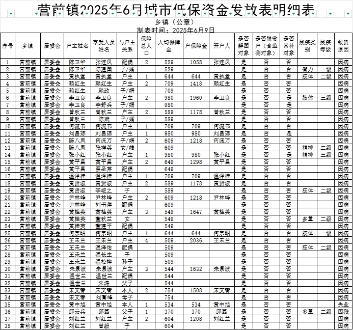 營(yíng)前鎮(zhèn)2025年6月低保金發(fā)放表