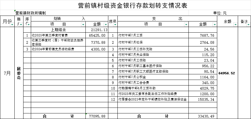 營前鎮(zhèn)居委會資金銀行存款劃轉(zhuǎn)支情況表