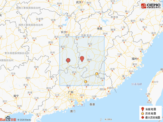 歷史地震:根據(jù)中國地震臺網(wǎng)速報目錄,震中周邊200公里內(nèi)近5年來發(fā)生3級以上地震共5次,最大地震分別是2020年8月12日在江西贛州市上猶縣發(fā)生的3.3級地震(距離本次震中0公里)和2016年7月8日在湖南郴州市蘇仙區(qū)發(fā)生的3.3級地震(距離本次震中124公里),歷史地震分布如圖。