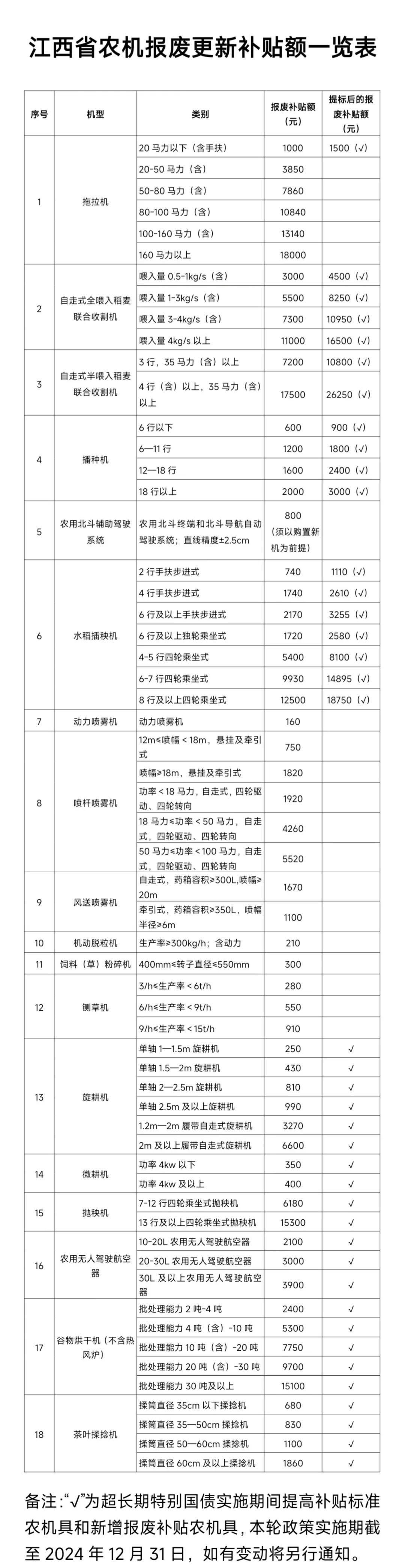 在超長(zhǎng)期特別國(guó)債支持農(nóng)機(jī)報(bào)廢政策實(shí)施期間內(nèi),對(duì)申請(qǐng)報(bào)廢聯(lián)合收割機(jī)、水稻插秧機(jī)、播種機(jī)并新購(gòu)置同種類機(jī)具,按50%提高補(bǔ)貼標(biāo)準(zhǔn);對(duì)報(bào)廢20馬力以下拖拉機(jī),報(bào)廢補(bǔ)貼額由1000元提高到1500元。詳見《江西省農(nóng)機(jī)報(bào)廢更新補(bǔ)貼額一覽表》。