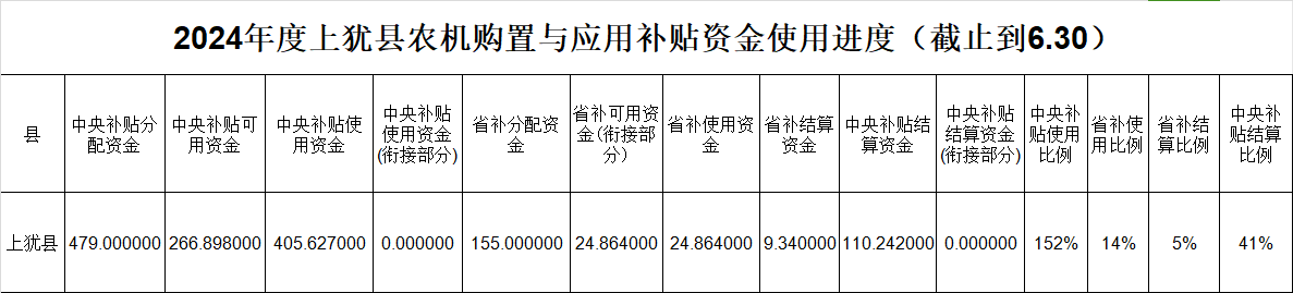 2024年度上猶縣農(nóng)機(jī)購(gòu)置與應(yīng)用補(bǔ)貼資金使用進(jìn)度(截止到6.30)
