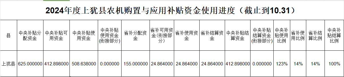 2024年度上猶縣農(nóng)機購置與應(yīng)用補貼資金使用進(jìn)度(截止到10.31)