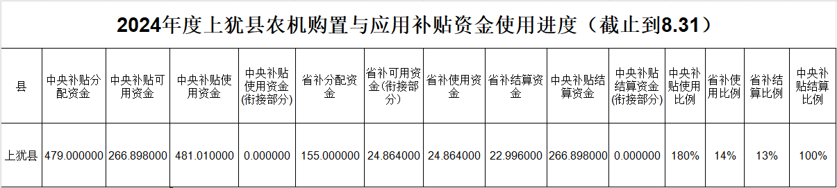 2024年度上猶縣農(nóng)機(jī)購(gòu)置與應(yīng)用補(bǔ)貼資金使用進(jìn)度(截止到8.31)