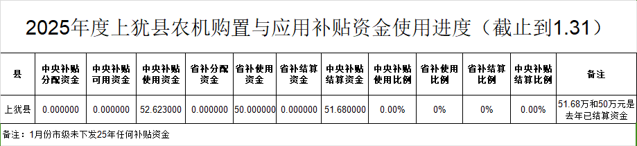 2025年度上猶縣農(nóng)機購置與應(yīng)用補貼資金使用進度(截止到1.31)