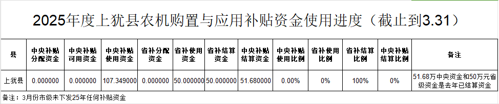 2025年度上猶縣農(nóng)機(jī)購置與應(yīng)用補(bǔ)貼資金使用進(jìn)度(截止到3月31日)