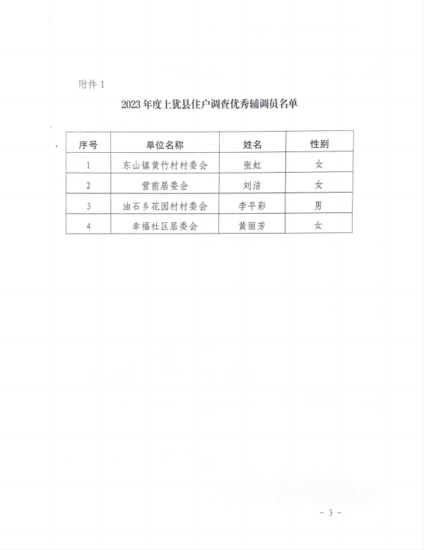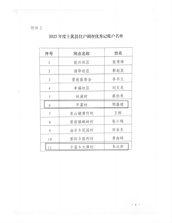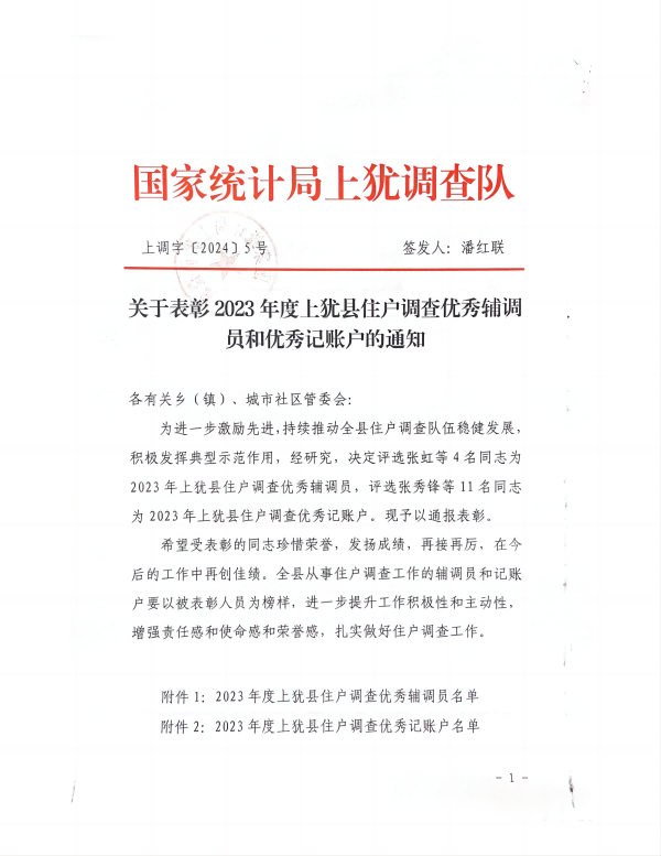 2024年1月10日,國家統(tǒng)計局上猶調(diào)查隊印發(fā)的《關(guān)于表彰2023年度上猶縣住戶調(diào)查優(yōu)秀輔調(diào)員和優(yōu)秀記賬戶的通知》,我鄉(xiāng)平富村鄒盛健、大潭村朱運新被評選為2023年上猶縣住戶調(diào)查優(yōu)秀記賬戶。予以通報表彰。