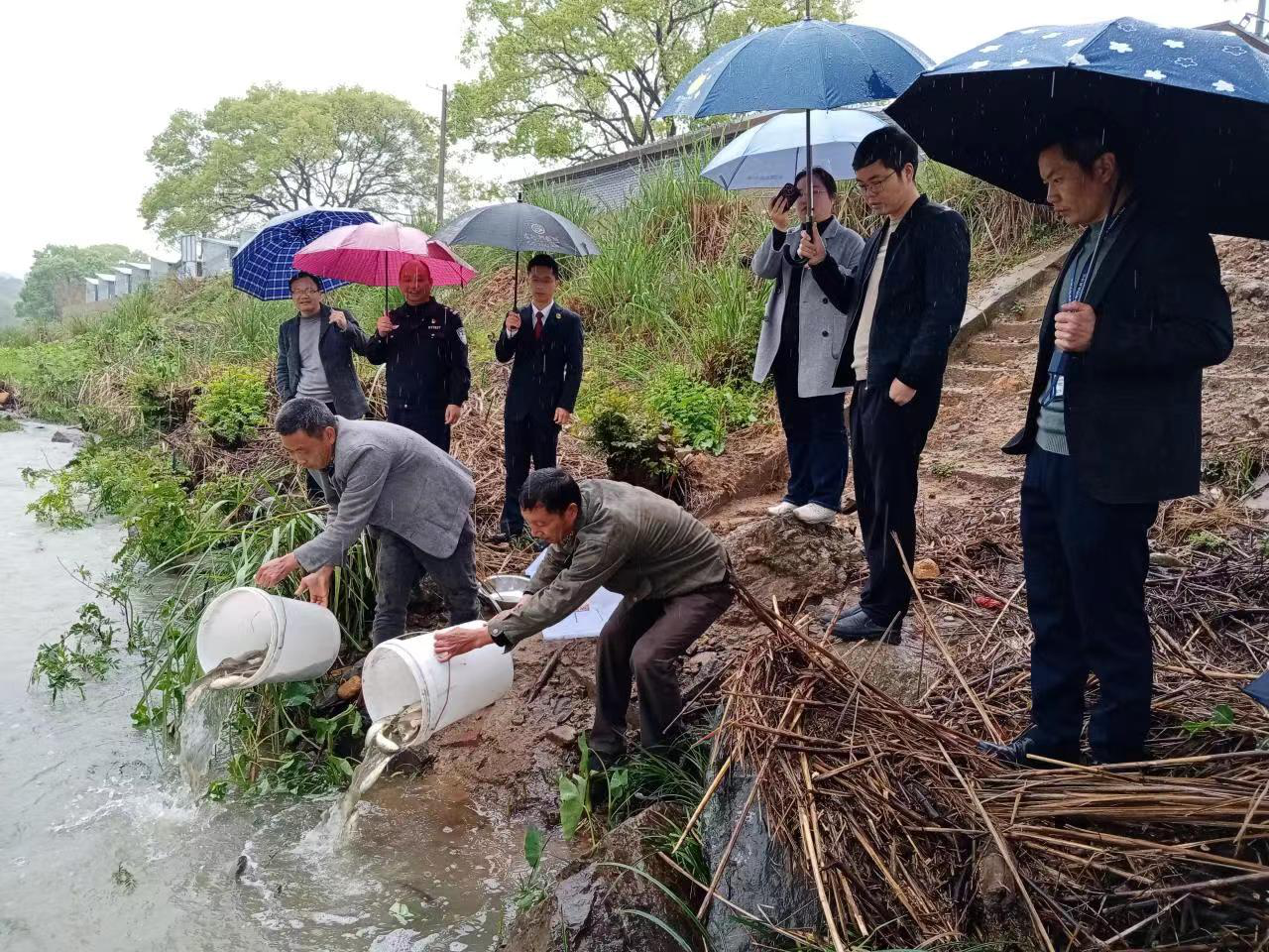 3月17日,上猶縣河長(zhǎng)辦會(huì)同檢察、公安、農(nóng)業(yè)農(nóng)村等多家部門(mén)與當(dāng)?shù)剜l(xiāng)村干部一同現(xiàn)場(chǎng)監(jiān)督劉某、羅某、廖某等三名非法魚(yú)者將自費(fèi)購(gòu)置的3000多尾魚(yú)苗投放到龍華江社溪鎮(zhèn)江頭村流域內(nèi)。這是上猶縣建立實(shí)施河長(zhǎng)制“河長(zhǎng)+檢察長(zhǎng)+警長(zhǎng)”工作體系,嚴(yán)厲打擊涉河涉水和破壞水生態(tài)文明的違法犯罪行為,采取的“增殖放流”恢復(fù)性司法模式,促進(jìn)水生物生態(tài)的修復(fù)實(shí)踐。
