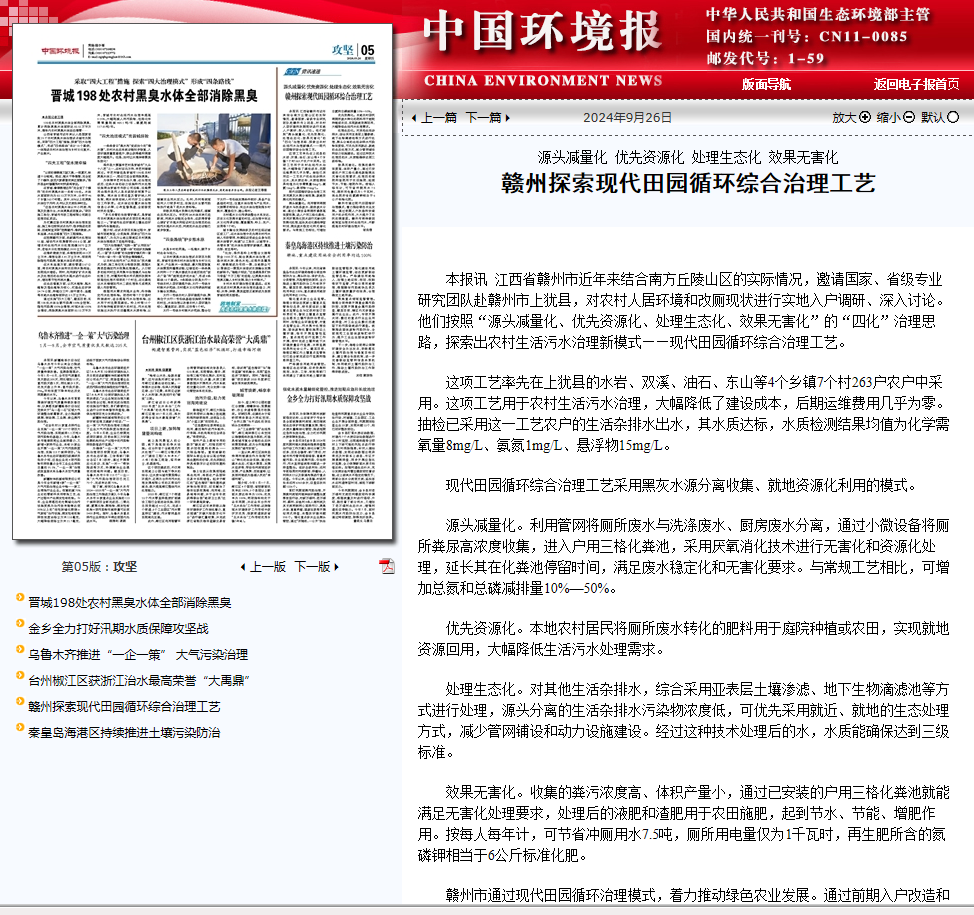 今天《中國環(huán)境報》攻堅版刊登新聞《贛州探索現(xiàn)代田園循環(huán)綜合治理工藝 》